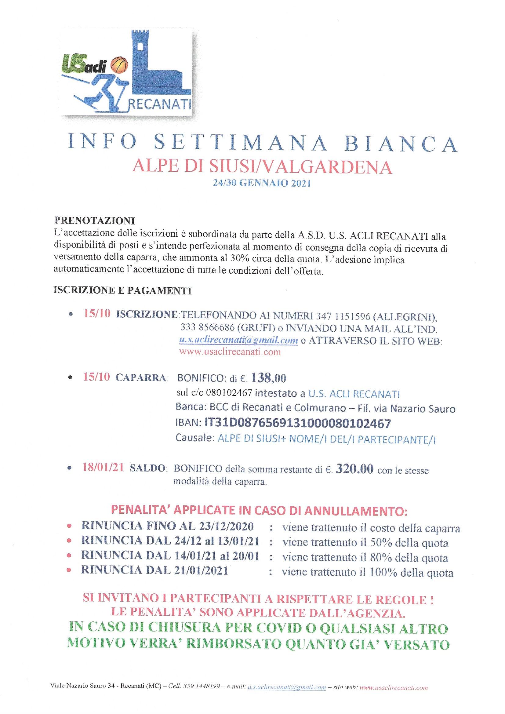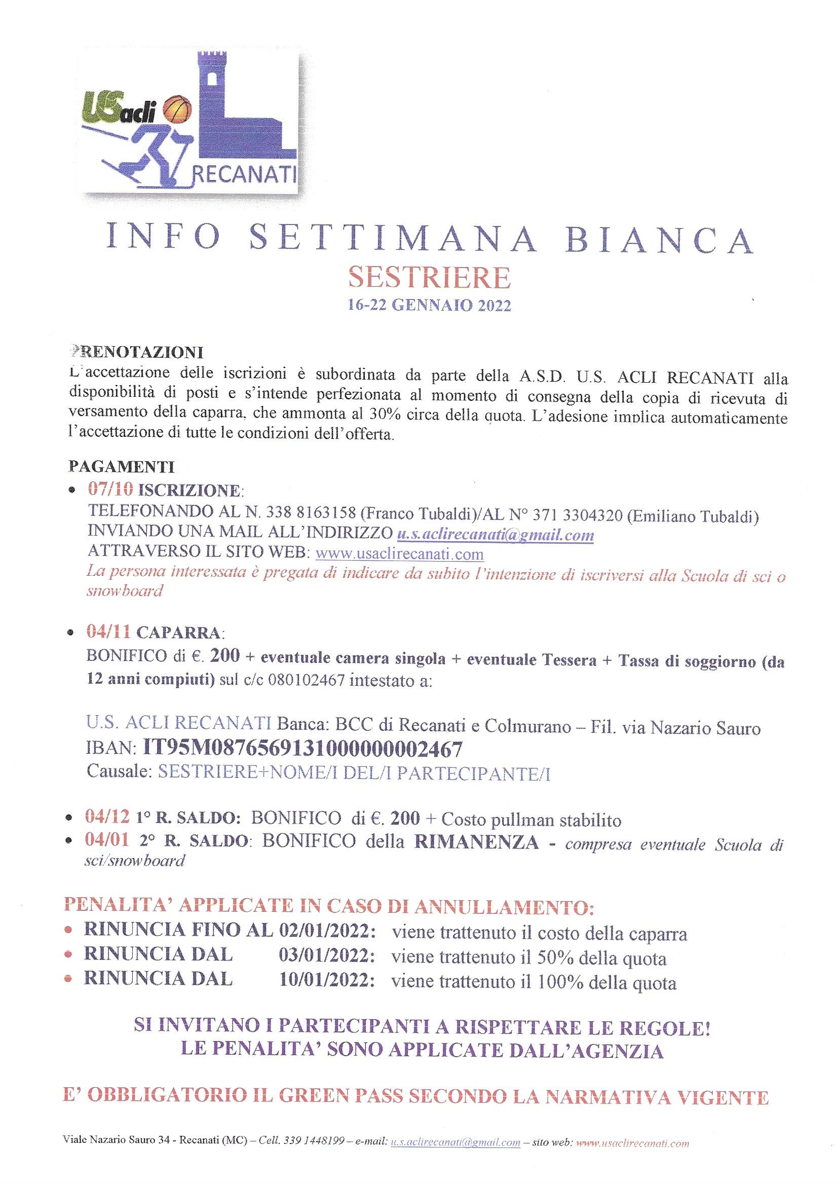 ATTENZIONE: LA PARTENZA E' PREVISTA DOMENICA 23 GENNAIO 2022 ALLE 7,55 DAVANTI LA SCUOLA MEDIA